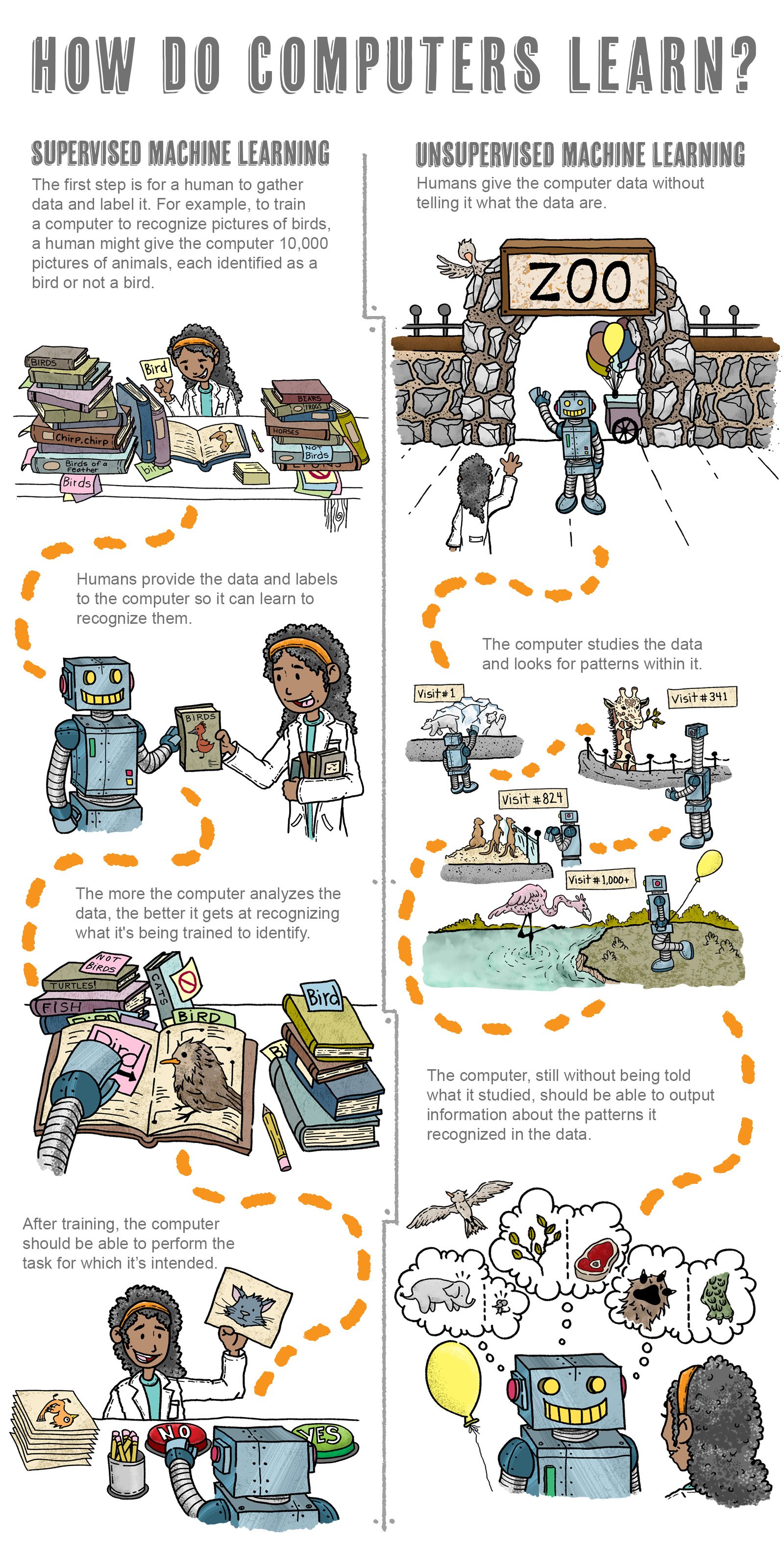 This comic illustrates supervised and unsupervised approaches to machine learning.
