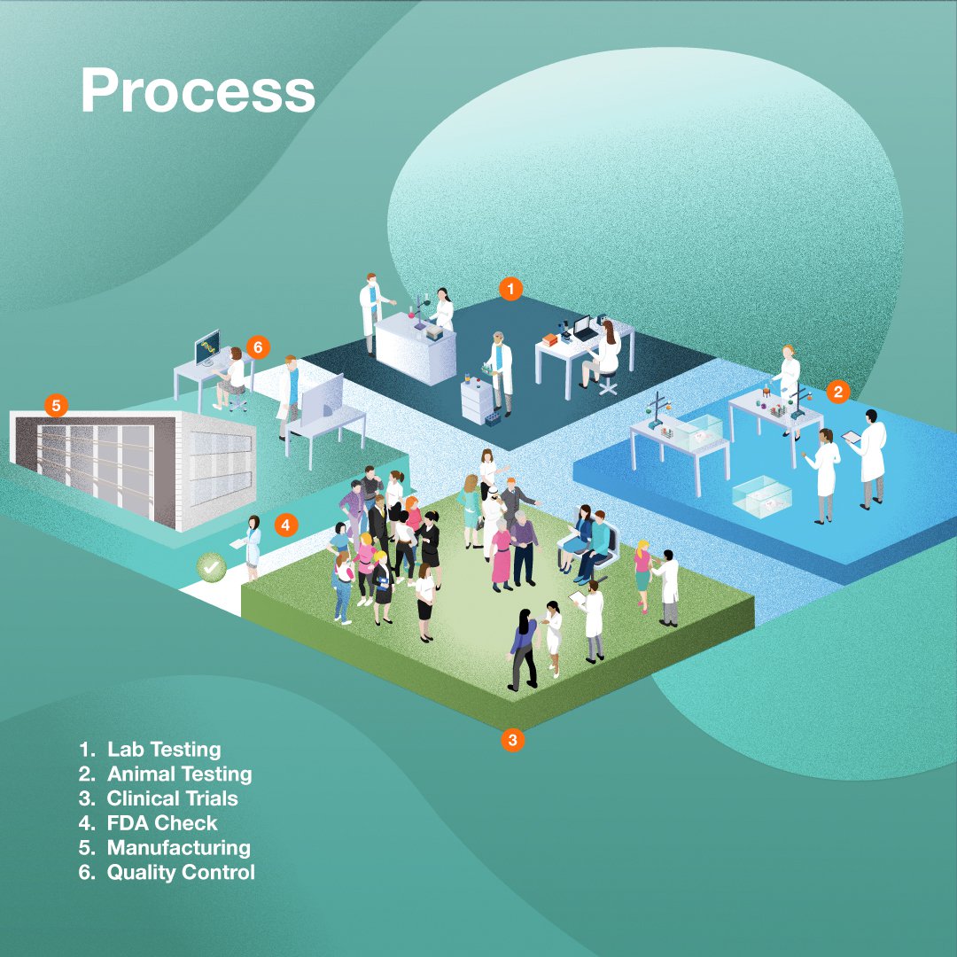 After successful clinical trials, the vaccine goes through the U.S. Food and Drug Administration (FDA) multistep approval process, and, finally, manufacturing and quality control.