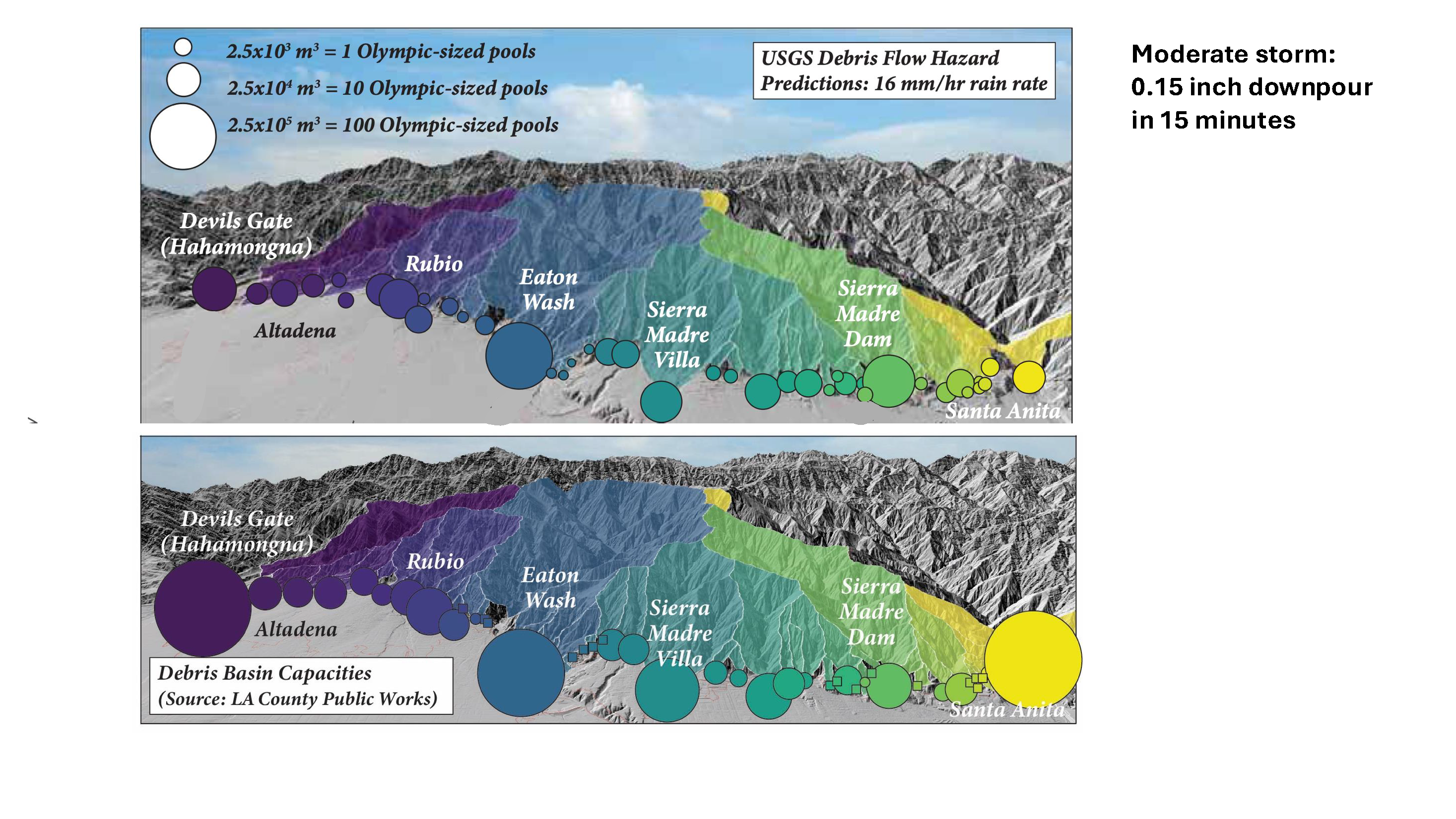 In the wake of the Eaton fire, we can measure these four variables and try to predict what might happen. What we see, for the most part, is that the capacity of the basins is larger than the amount of material that we expect to come off the mountains. That's good—that's what we want, to be able to capture all that material, so that it's not coming down into neighborhoods.